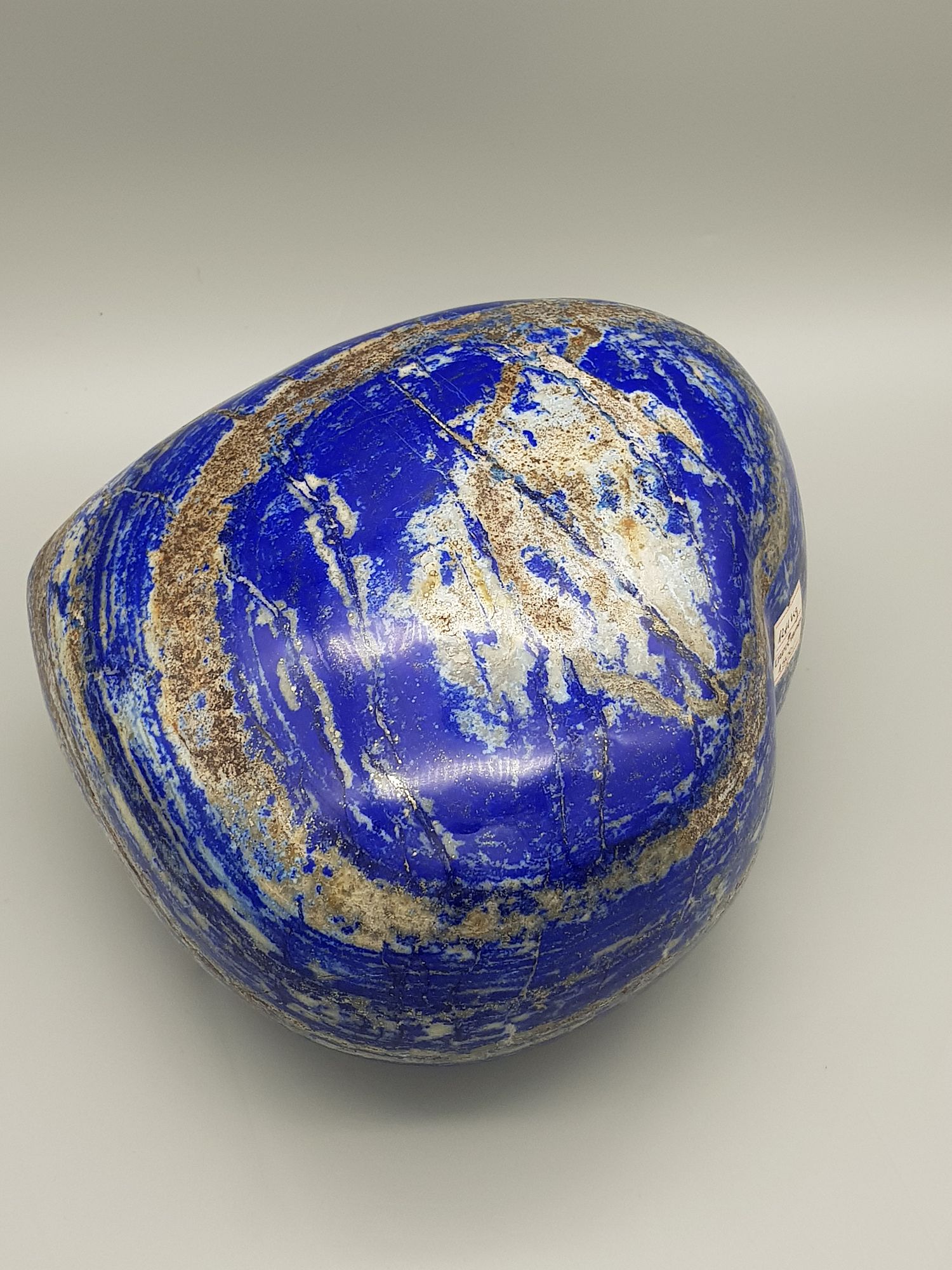 dieser Lapis Herz ist mit seinen über 12kg mächtig. Wie auf den Fotos zu sehen ist, hat dieser Lapis eine intensiv blaue Farbe mit goldenen Pyrit und weißen Calcit Streifen. Das Herz ist mit seiner Größe und Farbe ein sehr besonderes Deko Objekt und lässt das Herz jedes Mineraliensammlers höher klopfen.